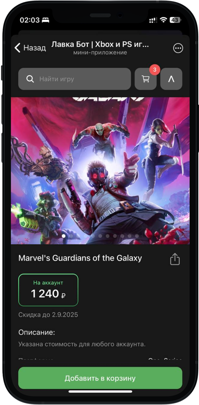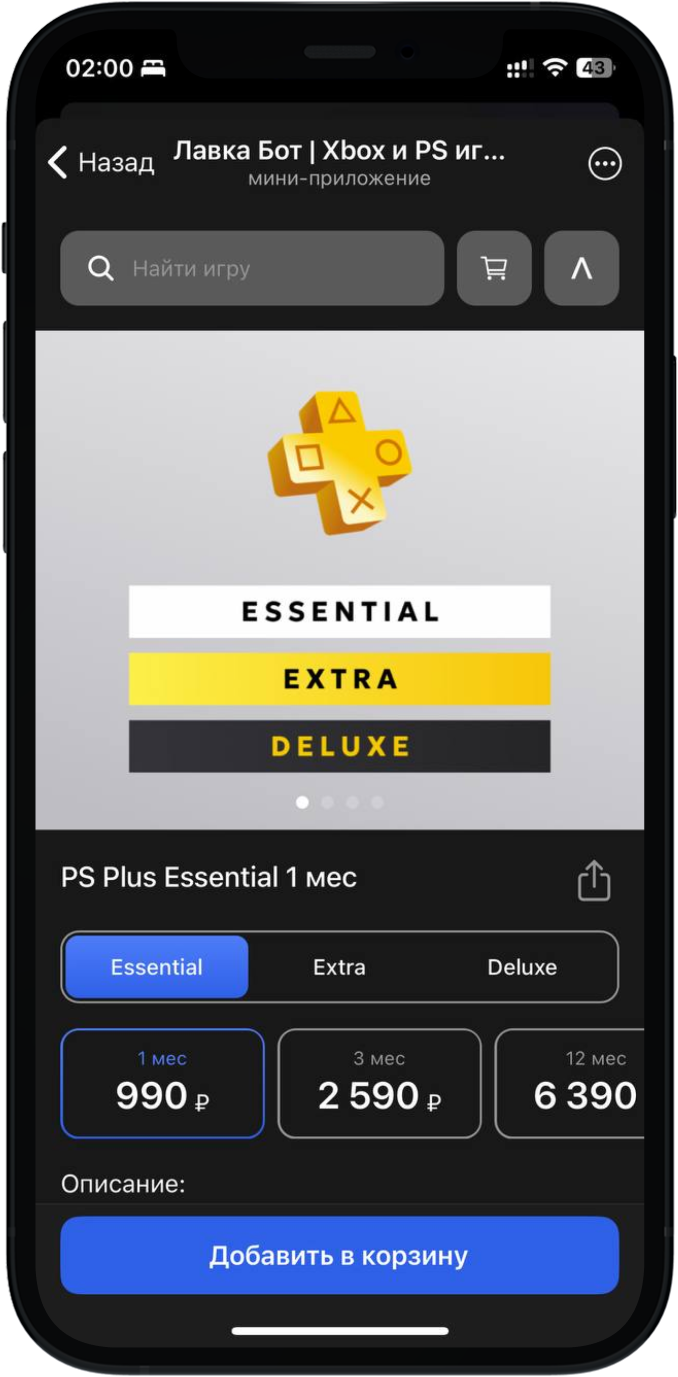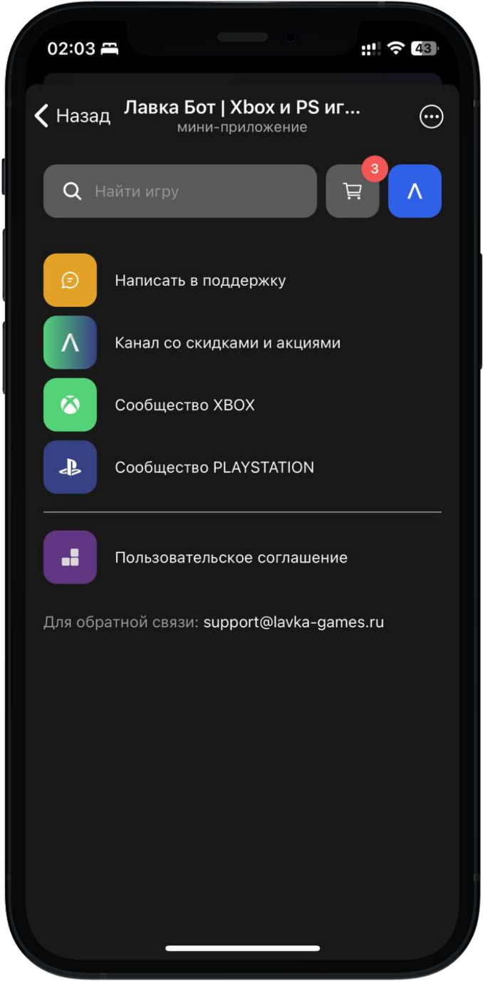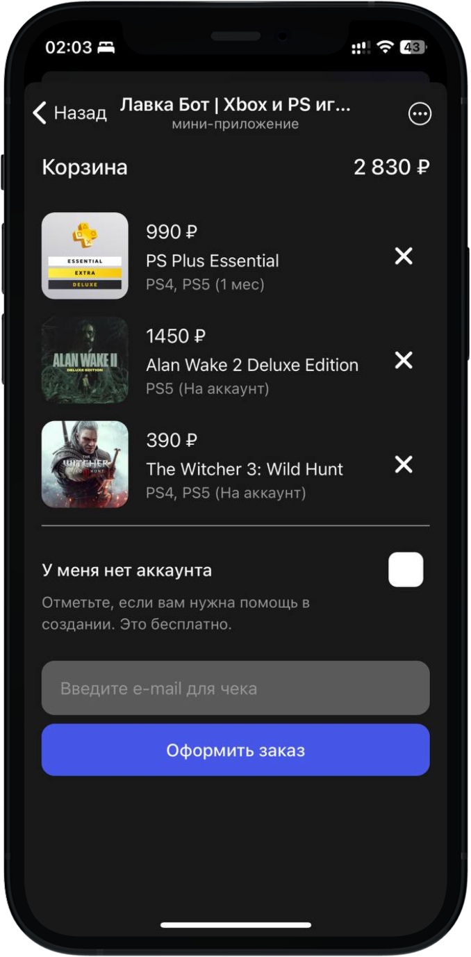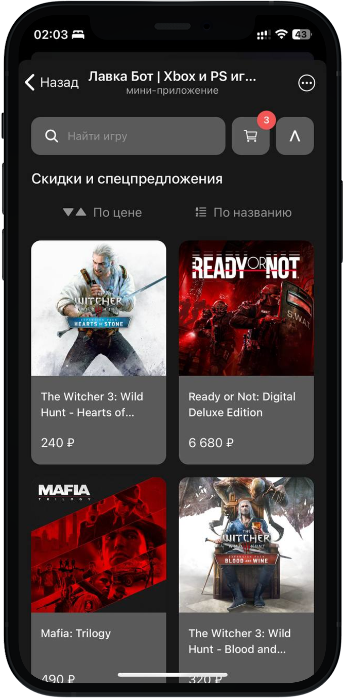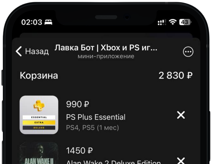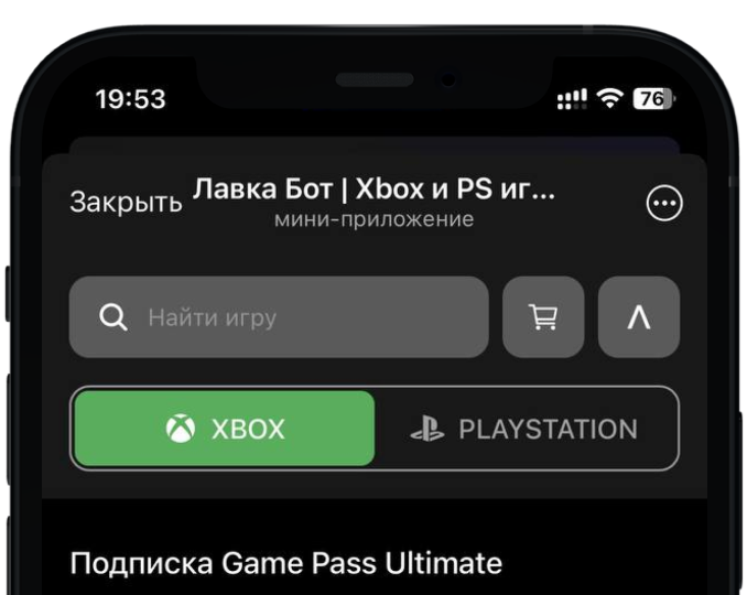 Через приложение в Телеграм. Оно выглядит как магазин PlayStation и Xbox: в нём актуальные